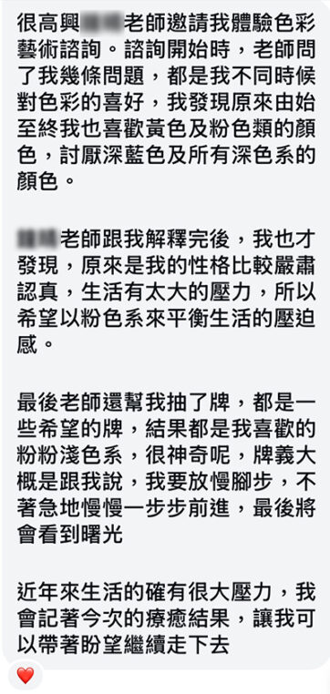 色彩解讀結合選色+色彩牌卡,將帶領您深入探索自我、 從中認識自己,了解個人內在狀態,並從中協助您得到相關指引及建議。